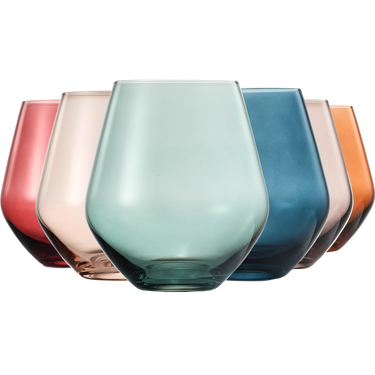 - This set of six stemless glasses features an assorted set of colors perfect for entertaining! Pure luxury accentuated in every detail from the color saturated top rim to the bottom of each glass. This set features a tall, sleek silhouette that makes an impression from across the room. Every glass in this set is unique, yet equally beautiful. The hand-blown style and vibrant colors of our luxury wine glasses are sure to be a conversation piece around your table.