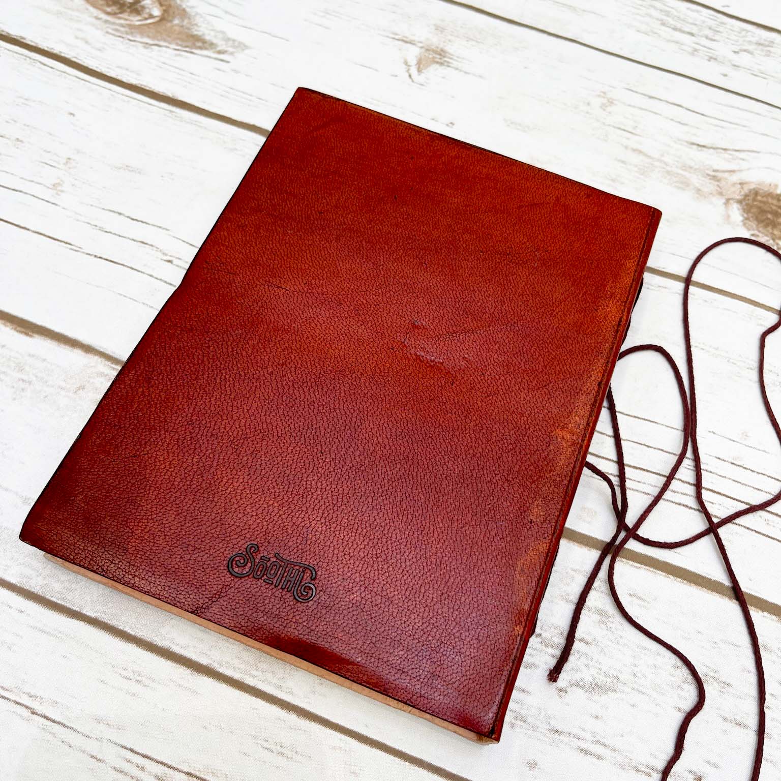 - Material: Sustainable salvaged leather cover material with a string tie closure