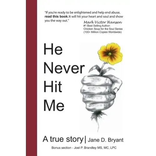 He Never Hit Me A True Story - Jane Bryant "If you're ready to be enlightened and help end abuse, read this book. It will hit your heart and soul and show you the way out." Mark Victor Hansen #1 Best Selling Author: Chicken Soup for the Soul Series (Over 100 Million copies worldwide) He Never Hit Me gives a real-life glimpse into what it's like living with daily emotional abuse. "She had wanted him to hit her, to strike her, to bruise her skin. No, she didn't want the pain or the humiliation, but she wanted the outside of her body to match the inside of her shredded heart. Then she would have something to show Then everyone would know how much he really hurt her and the children, and she would have something tangible to hold on to and hold up to the world. But he was far too cunning for that; and he knew that what he could do to her was much worse... The invisible scars he inflicted reached her marrow and rooted in her soul..." As Jane describes the events of her marriage, readers will gain insight into their own lives and relationships - or the lives of friends and loved ones - who may be going through similar circumstances. They will find courage in watching Jane gain the strength to get out and stay out. "The first step in healing is awareness, and He Never Hit Me is a powerful mirror for far too many women's unseen wounds." Joel Brandley Therapist MS, MC, CMHC. "A most powerful tool for those who are experiencing emotional abuse and fear in intimate relationships. Lives can be saved and we know that unless trained intervention takes place, the abuse escalates. This book provides an opportunity for the people to see themselves in a wide variety of circumstances whether as a parent, a family member, friend, or one experiencing the abuse, and find the strength to take action to feel safe, change, and move forward." Judy Kasten Bell Retired Executive Director, Utah Domestic Violence Council