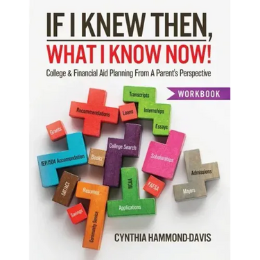T he college and financial aid planning process can be a confusing puzzle. This workbook helps families plan ahead so that all of the pieces come together. If I Knew Then, What I Know Now, is a true story of one mother's struggle to find help with putting all of the pieces of the college search, financial aid, scholarships, athletics, extracurricular activities, together. Through trial and error she learns how to help her children with the process. This workbook was also written to help parents and students with early college awareness. College and especially financial planning for college should start as early in a child's life as possible. Colleges are expensive and every family/team needs a plan