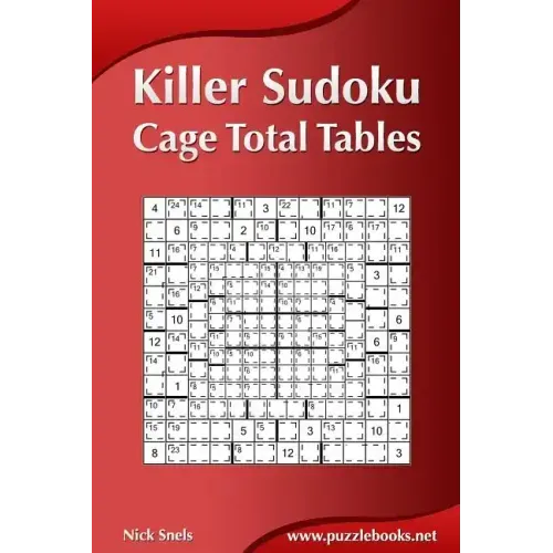 Killer Sudoku - Cage Total Tables lists the cage total tables for the following Killer Sudoku sizes: 6x6, 8x8, 9x9, 10x10 and 12x12. You will find this book an extremely valuable reference tool when you play Killer Sudoku. You quickly find all the possible combinations for all the possible sums.