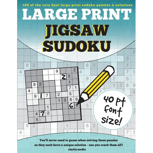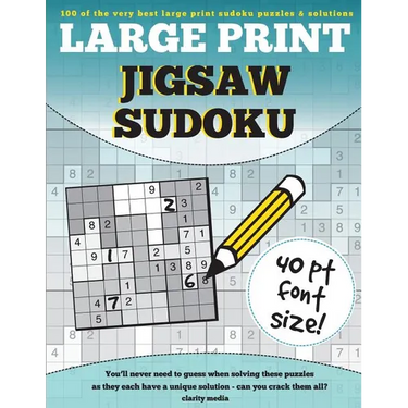 This book features our best collection of jigsaw sudoku puzzles in large print font size. If you enjoy classic sudoku or other variants, but struggle to clearly see the numbers in the grid then this is the book for you We have created the grids with a huge font size of 40pt This is generally 4 times the sizes of a standard puzzle. Jigsaw regions are also coloured in different shades of grey to help the eye see the shape. If you are new to this puzzle type, How To Solve instructions are featured inside. We have also included solutions towards the back so if you need a helping hand along the way, take a peek there Good luck and happy solving