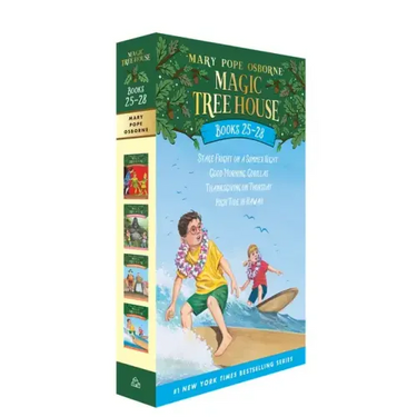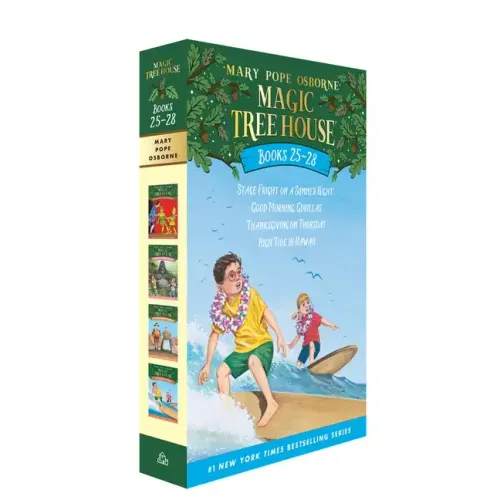 Travel all over the world and across time in the magic tree house Jack and Annie are just regular kids, but Morgan le Fay, the magical librarian, thinks they're ready to learn some magic. What kind of magic? Find out when Jack and Annie meet William Shakespeare, a group of gorillas, the Plymouth Pilgrims, and a couple of great surfers from Hawaii Books in this set include Stage Fright on a Summer Night (#25), Good Morning, Gorillas (#26), Thanksgiving on Thursday (#27), and High Tide in Hawaii (#28). Did you know that there's a Magic Tree House book for every kid? Magic Tree House: Adventures with Jack and Annie, perfect for readers who are just beginning chapter booksMerlin Missions: More challenging adventures for the experienced reader
