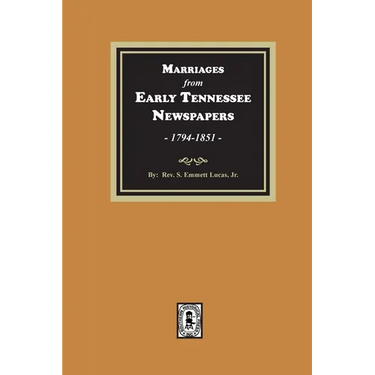 Until their publication by S.H.P., Inc., these marriage records from the EARLIEST Tennessee newspapers had been available ONLY at the Tennessee State Library and Archives in Nashville in their card files. These marriage notices cover the ENTIRE state of Tennessee for the most part, beginning with the earliest ones in 1794 in the Knoxville Gazette. The total number of such marriage notices is approximately 12,000 or more and contains such information as: name of bride's father, often times both bride and groom's place of residence (county and state); sometimes the groom's occupation; date of marriage and where it was performed and sometimes the officiating minister's name; ages of Bride and Groom. A brief resume of states other than Tennessee where such marriages were performed or the former home of either the bride or groom: AL, AR, CT, FL, KY, MS, MO, MD, LA, IA, IN, IL, NY, NC, NJ, OH, PA, SC, VT, WV, & VA to cite but a few. Newspapers from which these Marriages have been taken: The Knoxville Gazette, The Daily Republican Banner, The Western Weekly Review (Franklin, TN.), The Politician and Weekly Nashville, The Nashville True Whig and Weekly Commercial Advertiser, National Banner, Impartial Review and Cumberland repository, Nashville.