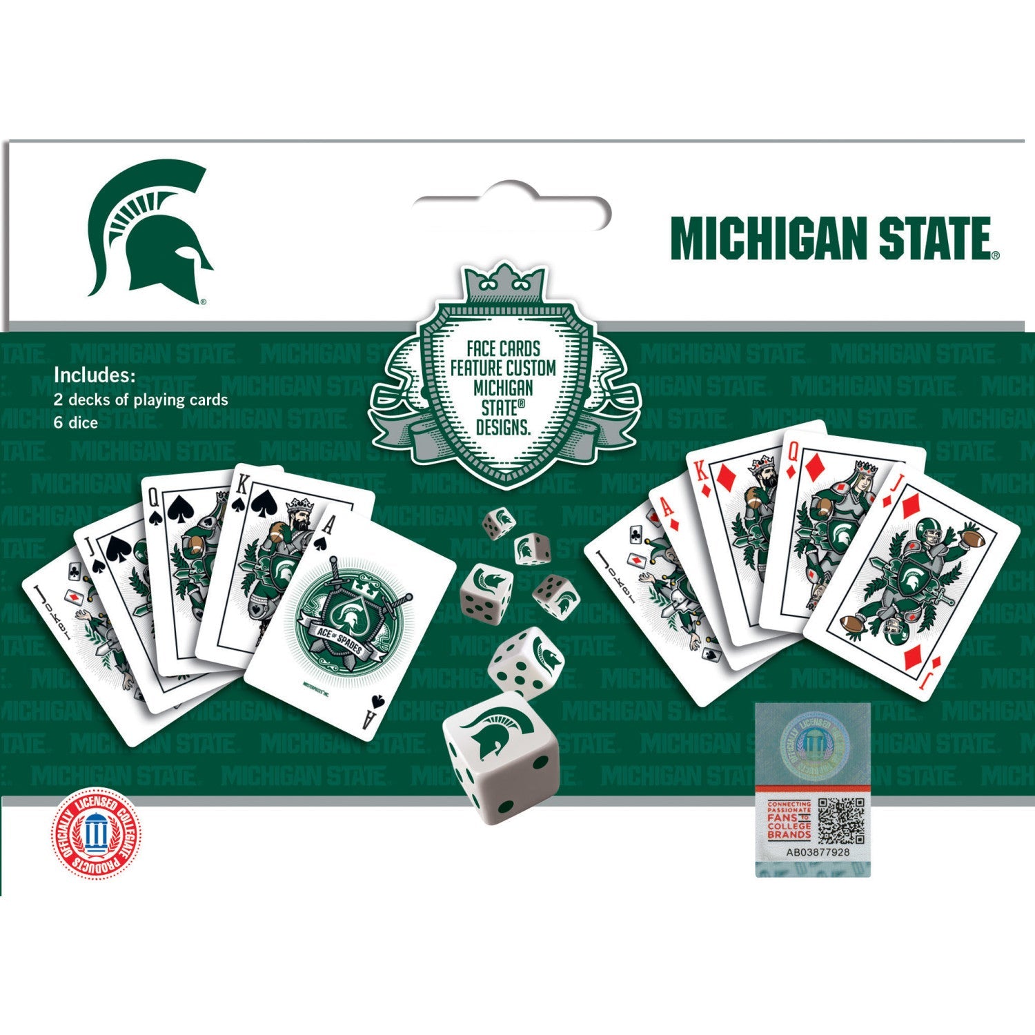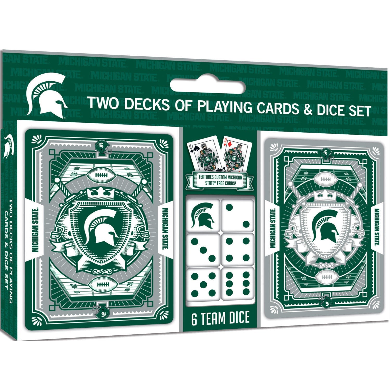 Who says you can't bring the casino to your next game night? These Officially Licensed NCAA Michigan State Spartans 2-pack playing card and dice sets are perfect for any game night. The high-quality Casino Style Cardstock playing cards are perfect for any fan of the Michigan State Spartans. The deck features a unique team design and comes with a 6-piece 16mm D6 gaming dice set. Whether you're playing some poker or trying to beat the dealer at blackjack, these cards will help you do it in style. So roll the dice and get ready to bet big, because, with this set, you're going to win big. Go Team!Free shipping on all U.S. orders
