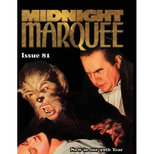 Midnight Marquee magazine issue 81, now in it's 59th year of publication includes THE RETURN OF THE VAMPIRE: Bela Lugosi's Finest Hour as an Undead Count by Barry Atkinson; THE BLACK ROOM: Boris Karloff as Victim and Villain by Nathalie Yafet; THE MAN IN THE WHITE SUIT: The Science in Fantasy by Don Mankowski; THE CAT CREEPS (1946) Pussyfooting ... Universal's Last Gasp of Horror by Greg Mank; ROBERT BLOCH: More Than Just "the Author of Psycho"; by Jim Nemeth The Mighty MILTON REID by Christopher Gullo; HAUNTED: A Critical Appreciation by Barry Atkinson; VILLAGE OF THE DAMNED: Locations Then and Now by Ray and Gail Orwig; HORROR STRIKES THE FAMILIAR ... When you Least Expect It!; by Gary J. Svehla; Flying Under The Radar: THE PHANTOM OF THE MONASTERY by Gary J. Svehla; MIDNIGHT MARQUEE Book Reviews MIDNIGHT MARQUEE Movie Reviews by Gary J. Svehla