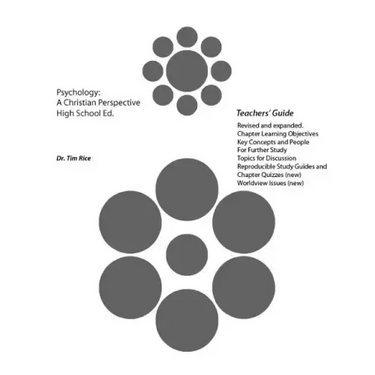 Teachers' Guide accompanying Psychology: A Christian Perspective. High School Edition student textbook. Teachers need both. Reproducible quizzes and study guides. Essay question suggestions with answers. Topics for discussion with students. Worldview issues to help teacher weave the Christian worldview into every lecture.
