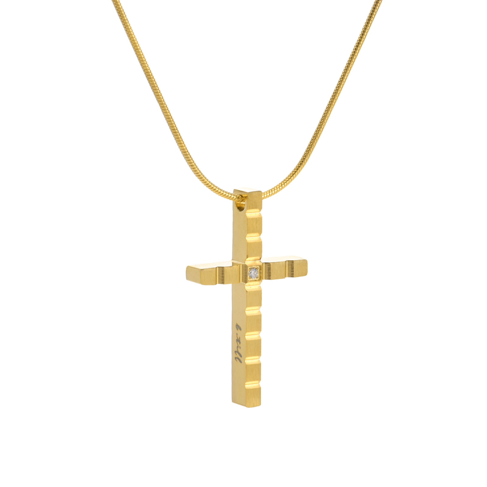 The cross is made from superior surgical-grade stainless steel, which has a high flash and is hypoallergenic, with a .04 ct B.Tiff Diamond Alternative stone in the center of the cross. Our stones have been cut to display as much light as possible. They even rival the best mined diamonds in terms of fire and flash.