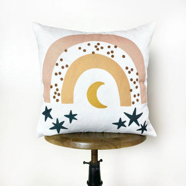 Part of our baby collection. This delightful Rainbow with stars nursery pillow is a wonderful addition to your nursery decor. Pair with our super soft Down Alternative insert for a great soft pillow.