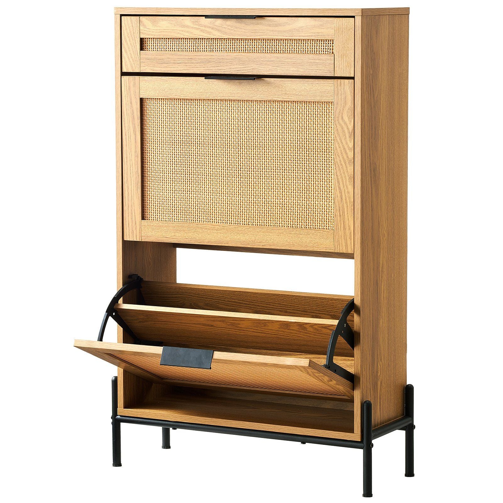 3.Minimalist Versatile Design: With its classic rattan finish, metal supporting legs, and aluminum alloy handles, this rattan shoe storage cabinet is simple yet stylish, seamlessly blending with various home decor styles to achieve overall harmony and aesthetic appeal.