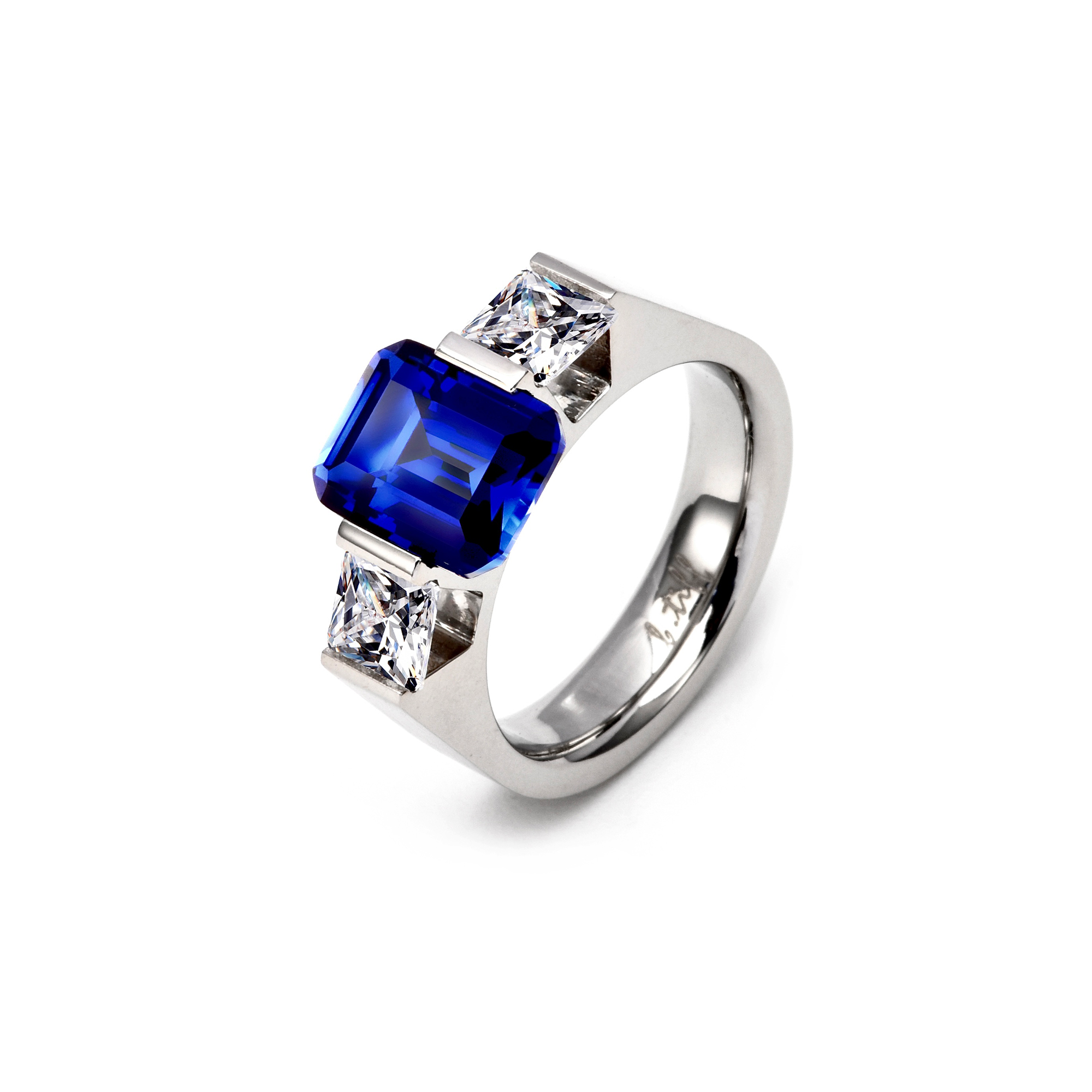 Searching for an engagement ring that embodies your special love and sophisticated taste? This ring will satisfy. At the center is a massive 3 ct Blue Emerald cut stone along with two 1 ct princess cut stones - one on each side and deeply polished metal ring band, this ring is a sight to behold.