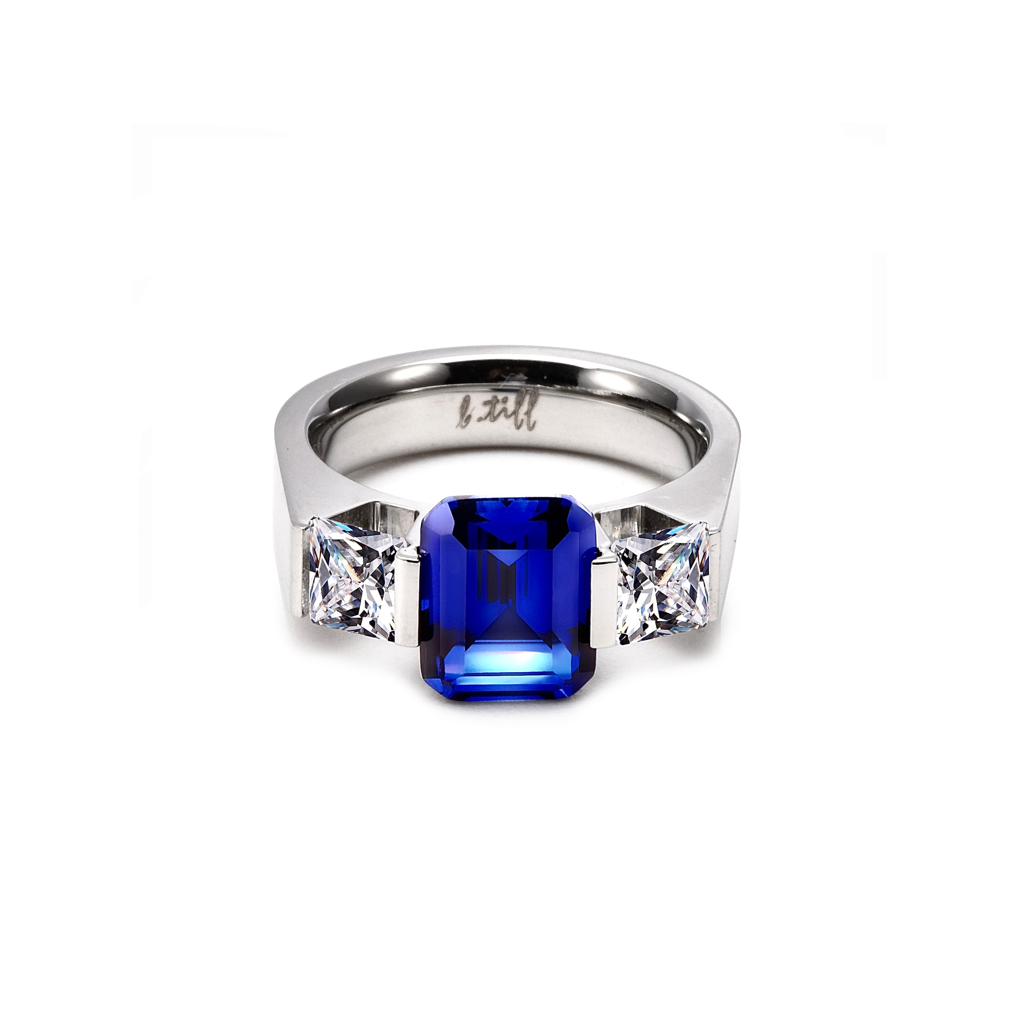 Arranged beautifully and cut to perfection, these stones give the piece a dramatic flair. Our B.Tiff Diamond Alternative stones are expertly cut for maximum light reflection at all angles. We only use stones that have more fire than mined diamonds and are resistant to fogging. The ring is crafted from a special surgical stainless steel that has been buffed and polished to shine as brightly as possible.