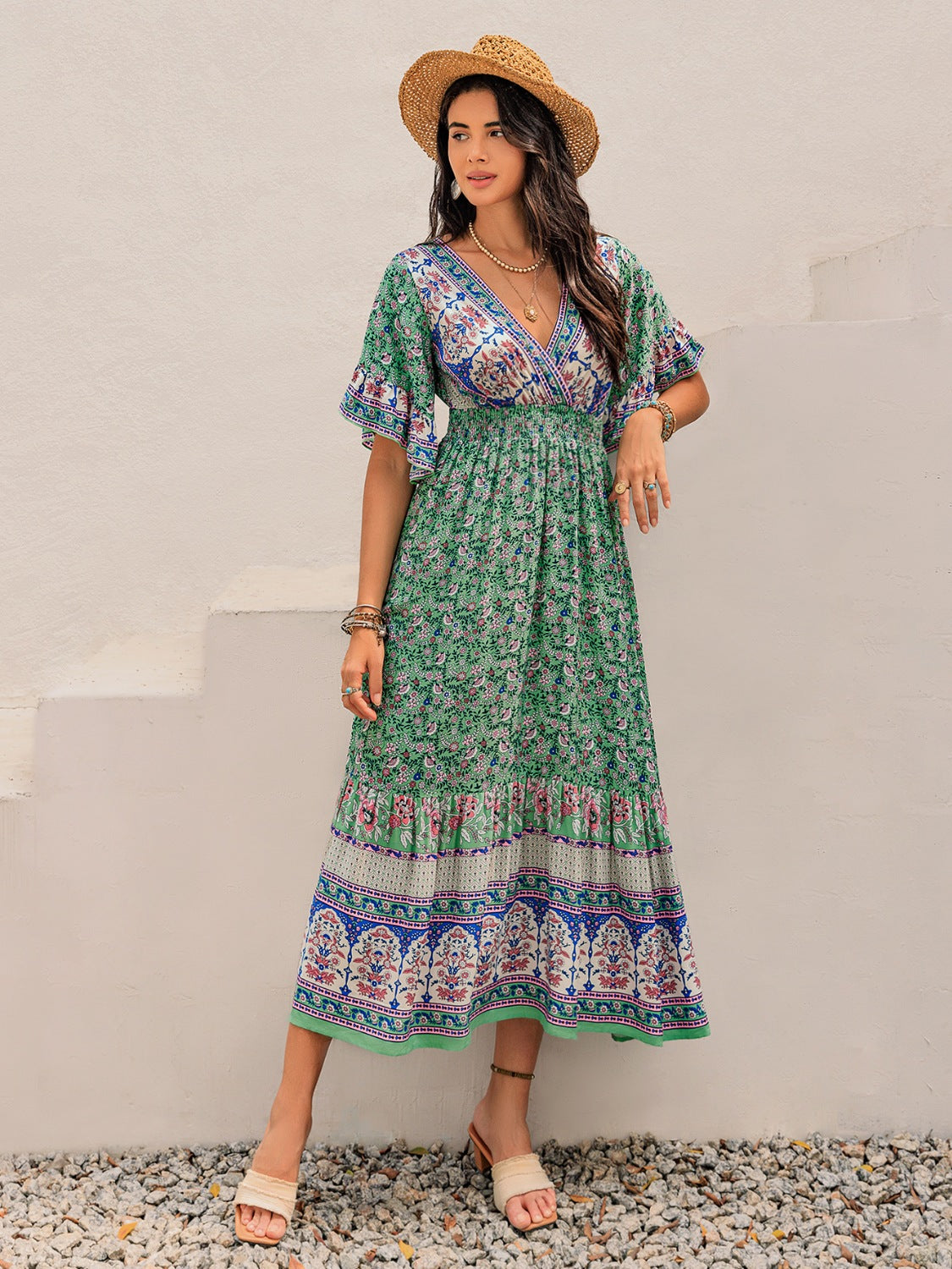 Ruched Printed Flounce Sleeve Midi Dress