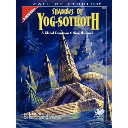 CALL OF CTHULHU ROLEPLAYING] "Shadows of Yog-Sothoth" is a modestly-sized campaign of seven scenarios. During the course of play the investigators penetrate the outer layers of a secret sinister occult organization led by the lords of the Silver Twilight. Beginning in Boston they investigate an organization in New York, run afoul of a coven in Scotland, roam the desert of the American southwest, vacation off the coast of Maine, and explore the mysteries of the South Pacific.