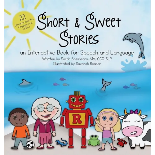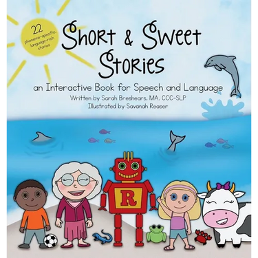 Short and Sweet Stories is an interactive book designed for speech-language pathologists (SLPs) and parents who want to foster articulation (speech) and language development in a single activity that children will love and look forward to over and over again. With stories rich in selected speech sounds, eye-catching artwork on each page, and language-stimulating comprehension questions, this book has been curated to help your children or students meet their speech and language goals.