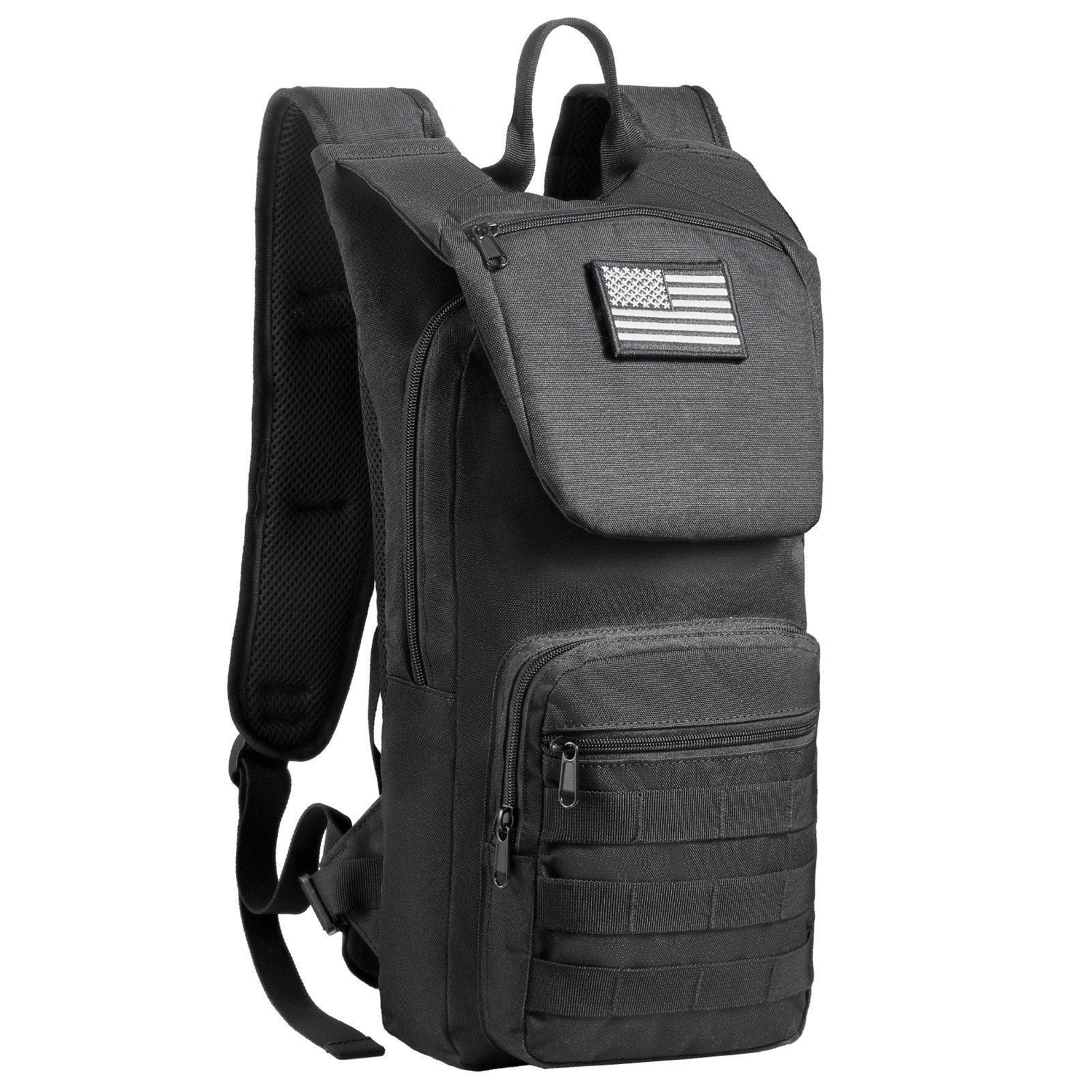 The hiking hydro backpack features a stylish camouflage exterior with an American flag patch, showcasing the unique personality of outdoor adventurers. Combining functionality and aesthetics, this tactical backpack adapts seamlessly to any outdoor setting.