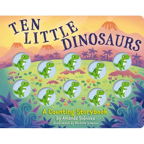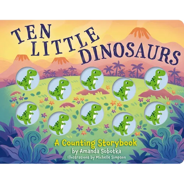 Ten little dinosaurs stomping in a line, along came a Pterodactyl and then there were. . . nine!?Learning to count has never been more fun. This unique board book counts from ten little dinosaurs all the way down to one with adorable illustrations. With each page, one more dinosaur disappears. To demonstrate this concept, this book uses tactile dinosaur buttons to help children count how many little dinosaurs are left as the story progresses. Follow along with the easy rhythm and rhymes of this story and let your child touch the colorful, built-in dinosaur toys for a creative, hands-on approach to counting. Start young ones on a lifetime of loving reading and learning with Ten Little Dinosaurs.