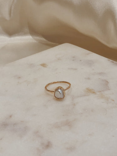 High quality, long lasting 14k gold filled ring, bezeled with a one of a kind freshwater keshi pearl.