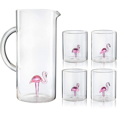 - Bring color and texture to your table with this Flamingo themed glassware set! Pour your favorite beverage into the tall rim glasses, and raise a toast to good friends. Superb quality with a heavy feel, crafted from borosilicate glass. Inspired by the amazing flamingo, this pitcher set will make an exquisite statement at your next gathering. The beautiful pink coloring is vivid against the glasses, making this pitcher and glass set both eye catching and functional!