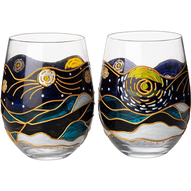 - BEAUTIFUL MASTERPIECE: These hand painted stemless wine glasses were individually made by artisan glassblowers and uniquely crafted. Each set comes with two hand-painted glasses designed for you and a loved one and features an incredible design inspired by the work of the legendary artist Vincent Van Gogh.