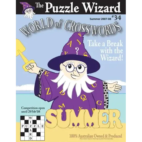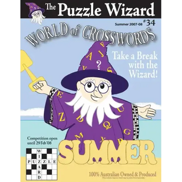 Issue No. 34 (Summer 2007-08) of the popular World of Crosswords by The Puzzle Wizard. World of Crosswords, first published in 1999, is a quarterly crossword book owned and based in Australia. The aim of the publisher, Greg Parker, is to provide a book of high-quality Australian crosswords at the best possible value. Indeed, each issue to date has included over six-and-a-half thousand clues (in the crosswords alone, not counting the variety of other puzzles). The crosswords, at least eighteen each of giant, large, and quick, are designed to provide a mental stimulus without proving too difficult. The clues cover a variety of different subjects, stretching worldwide and through the ages, all the time retaining an Australian point of view.